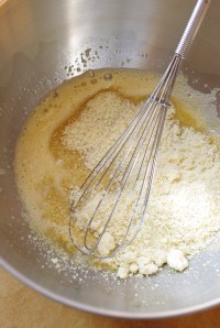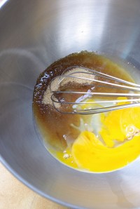 Préparer la crème amandine. Fouetter les oeufs avec la cassonade. Ajouter les amandes. Puis la crème d’amandes (ou crème liquide).