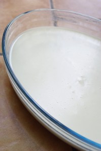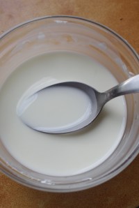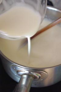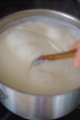 Faire bouillir le lait, ajouter la fécule diluée dans l’eau sans cesser de mélanger. Ajouter le mastic, et continuer de mélanger quelques minutes après les premiers bouillonements (de grosses bulles vont se former à la surface comme celles des chewing gum !) et jusqu’à épaissisement.