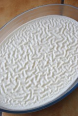 Verser dans un plateau à bords assez hauts. Laisser refroidir à température ambiante (1h) puis mettre au frigo plusieurs heures. Le dessus sera complètement « froissé » comme vous pouvez le voir sur la photo, c’est normal ! Au moment de servir, arroser d’un peu de sirop sur la surface, et couper en carrés. Avec le sirop, les carrés vont se retirer rapidement (ils glissent). Dans des coupes individuelles, mettre plusieurs cubes.
