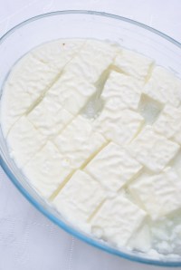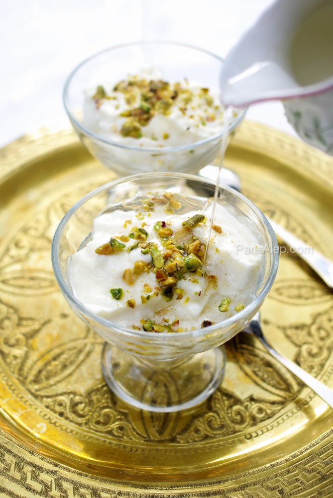 Une lectrice du blog m’a rappelé sur la page facebook, un dessert estival syrien de la région d’Alep, simple et délicieux : la hétaliyé [ الهيطلية ]. C’est un entremet à base de lait et de fécule, parfumé au mastic [المسكة]. On n’ajoute pas de sucre à la préparation mais du sirop de sucre (atr قطر) que l’on verse au moment de servir. La hétaliyé se sert traditionnellement très froide, coupée en cubes, et recouverte d’une boule de glace au lait et au mastic (une tuerie cette glace !) et aussi souvent de glaçons pour que les cubes de hétaliyé soient ultra frais. Résultat : un dessert frais, léger, doux et parfumé !