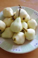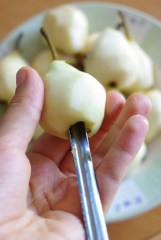 Laver les poires, éplucher et évider par le dessous (garder les tiges).