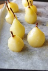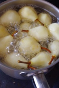 Plonger les poires dans le sirop chaud et laisser frémir jusqu’à ce qu’elles soient tendres (une dizaine de minutes pour mes petites poires). Retirer et laisser égoutter.