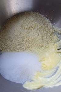 Préparer la crème d’amande : dans un saladier, fouetter le beurre avec le sucre et la poudre d’amande, puis ajouter l’oeuf et une pincée de cannelle.