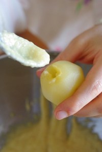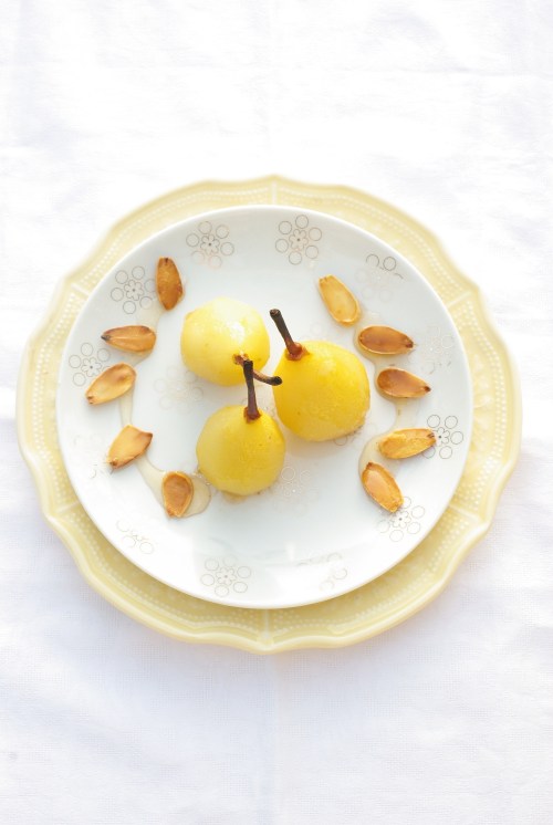 Je n’ai pas suivi la recette, mais j’ai repris l’idée de pocher une poire (à la cannelle plutôt qu’à la vanille), la farcir d’une crème d’amande et de la passer au four. Pour des explications plus détaillées sur comment pocher des poires au sirop, je vous conseille ce super billet du blog très pédagogue Le Sot L’y Laisse.
