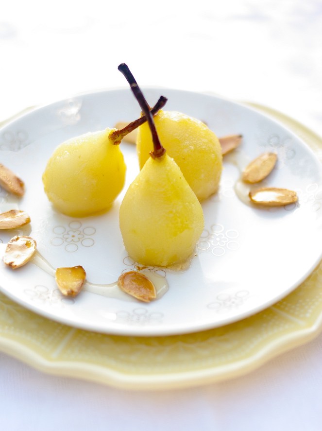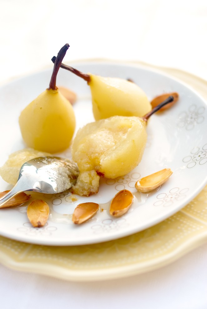 Un de mes poiriers a donné de toutes petites poires et plutôt que de les manger directement (trop jolies pour ça), j’ai préféré les utiliser dans un dessert. Et j’ai pensé à une recette d’un participant de Top chef 2011 (Alexis Braconnier) où il avait épaté le jury avec ses poires pochées à la vanille et crème d’amande. Je ne suis pas très fan des poires pochées car je trouve ça un peu lourd de manger une poire entière au sirop, mes mini poires étaient donc parfaites pour cette recette ! Et avec une crème d’amande, difficile d’y résister. Une sorte de tarte bourdaloue inversée, il suffit d’accompagner la poire d’un petit sablé !