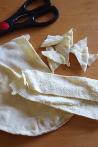 A l’aide de ciseaux, couper le pain en petits triangles (garder qu’une épaisseur).