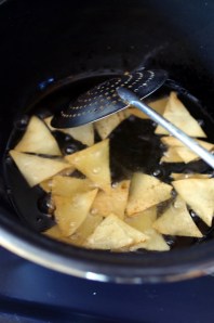 Faire chauffer l’huile, plonger les morceaux de pains jusqu’à ce qu’ils aient une couleur caramel uniforme (l’huile ne doit pas être très chaude sinon le pain va rapidement brunir). Egoutter sur du papier absorbant.