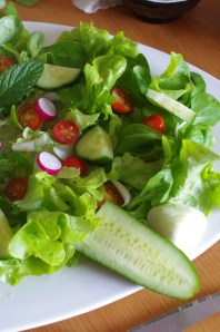 Couper des demi rondelles de concombre, des rondelles de radis, les tomates cerise en 2 (les miennes sont vraiment très petites mais exquises, elles sortent du jardin !) et des lamelles d’oignon.