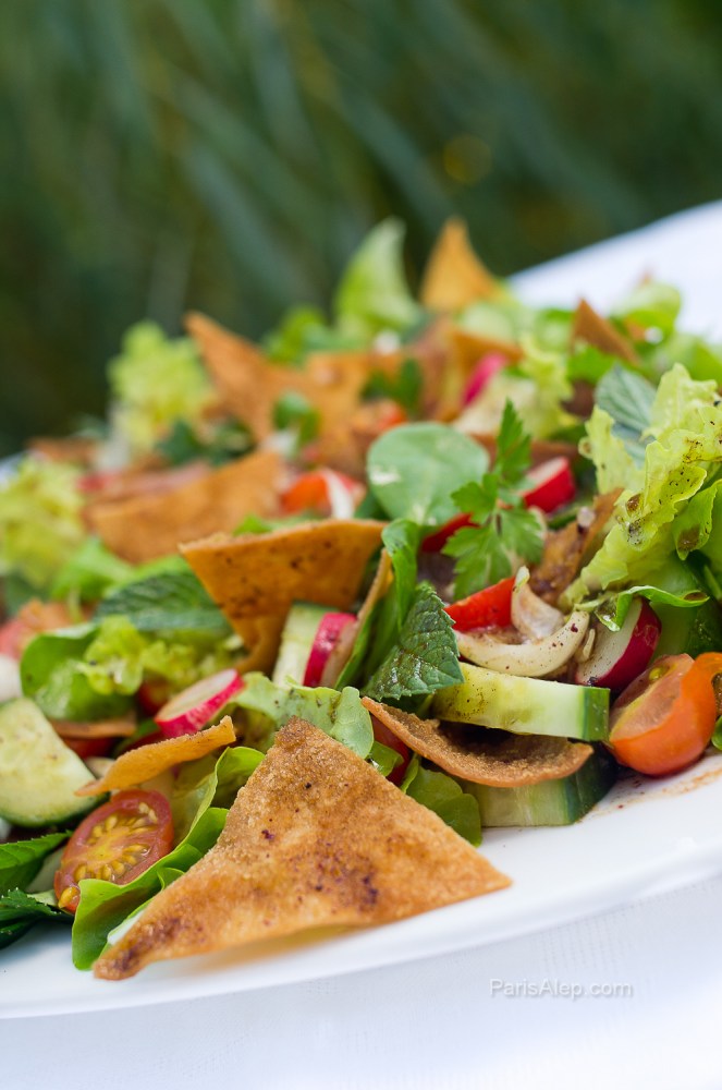 L’Eté n’est toujours pas terminé à Paris, le soleil est toujours là, alors on continue de manger des salades ! Et aujourd’hui on cuisine une salade syrienne (ou plus généralement levantine), bien fraîche et riche : le Fattouch  [الفتّوش]. L’origine du mot vient de « fatta » qui signifie déchirer du pain (car le pain levantin ne s’émiette pas).