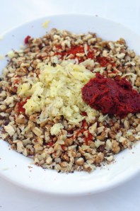 Piler l’ail. Mélanger les noix, l’ail, la pâte de piment et le piment, et un peu de sel.