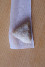 Poser une boule de farce à une extrémité de la bande (j’ai aplati la boule en triangle pour mieux visualiser la première étape du pliage).