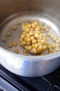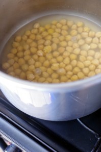La veille, tremper les pois chiches dans de l’eau (je congèle en quantité les pois-chiche après cette étape, sur la photo c’est un bloc de pois chiches congelés). Faire cuire à la cocotte minute le lendemain.