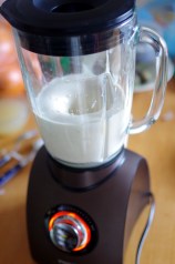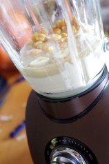 Mixer tous les ingrédients suivants (les 50 g de pois chiches, la tahiné, l’ail, le citron et le jus de cuisson) sauf le yaourt ! Sur les photos, c’est une erreur (un oubli avec l’envie de tester mon nouveau blender !!) d’avoir rajouter le yaourt dès le début. Car quand on mixe le yaourt, il devient liquide. Ne l’ajouter qu’à la fin.