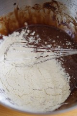 Puis ajouter la farine (préalablement tamisée). Mélanger au fouet pour obtenir un mélange homogène.
