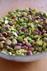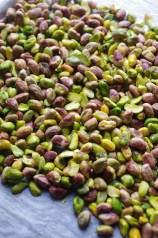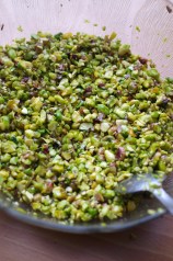 Mettre les pistaches dans un bol d’eau chaude une dizaine de minutes. Les peler puis les passer au four pour les sécher voire les griller (au choix). Cette étape est optionnelle.