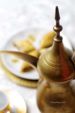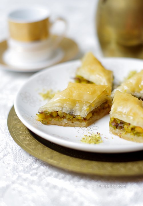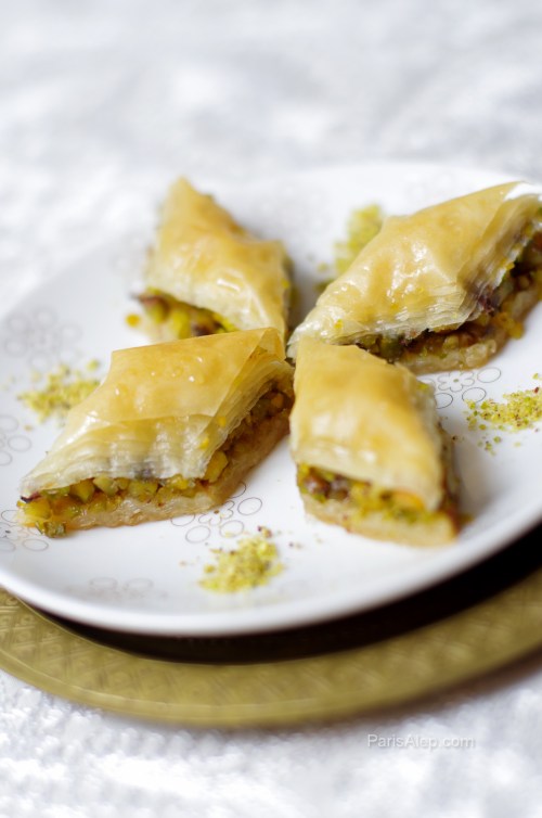 Passons à ce dessert. La baklawa [البقلاوة ] (j’ai volontairement orthographié « baklawa » et non pas « baklava » car on prononce bien un « w » en arabe) la plus populaire en Syrie est à base de pistaches d’Alep (grillées ou non). Et Alep est connue pour ses pâtisseries ancestrales aux pistaches, cultivées dans la région environnante. Ma mère me racontait que durant son enfance à Damas, on confectionnait des baklawa aux noix, mais aujourd’hui la pistache l’a largement emporté. Quand je dis « on », je parle bien sûr des pâtissiers, rares sont les personnes qui la font chez eux. C’est une pâtisserie que l’on achète lors des fêtes ou célébrations. Il existe des versions à base d’autres fruits secs comme les pignons ou les noix de cajou (version récente). La taille des baklawa a aussi vachement diminué avec le temps, on trouve maintenant des « micro » baklawa et c’est difficile de trouver une taille moyenne ou simplement mini.