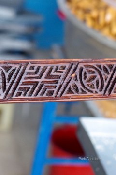 Une longue règle à empreintes, en bois, pour faire de beaux makroud.  A droite, des beignets (bambalouni)