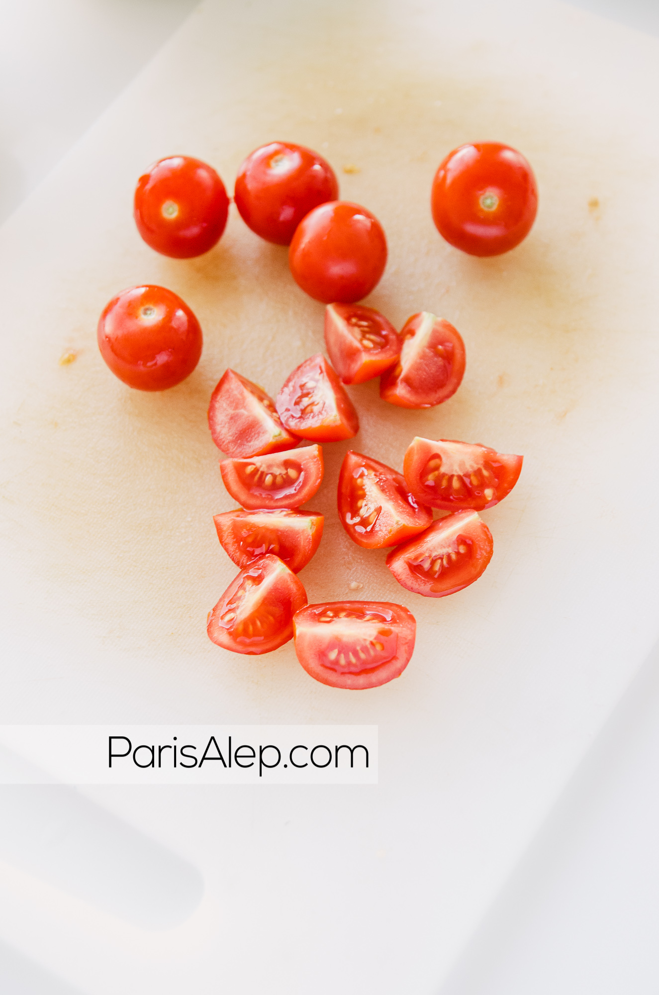 Couper les tomates cerises en quartiers. Mélanger le tout. Verser un filet d’huile d’olive, de mélasse de grenade et de vinaigre. Parsemer de graines de nigelle.