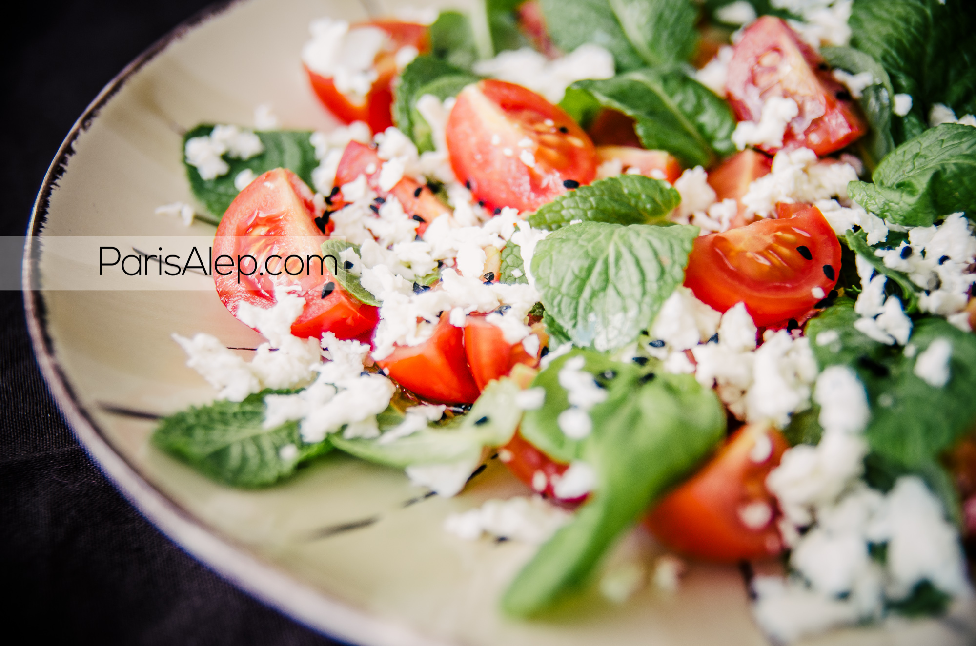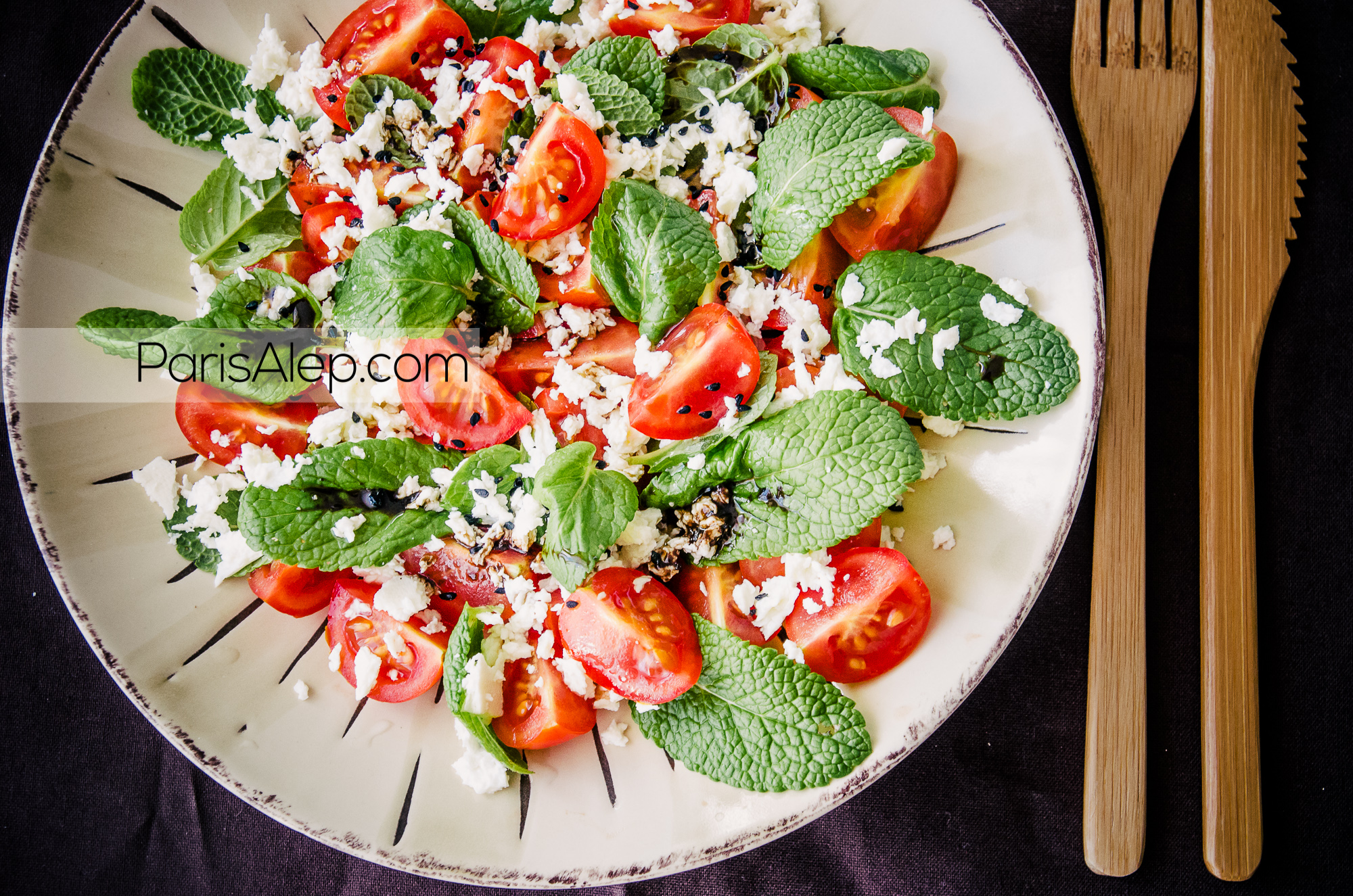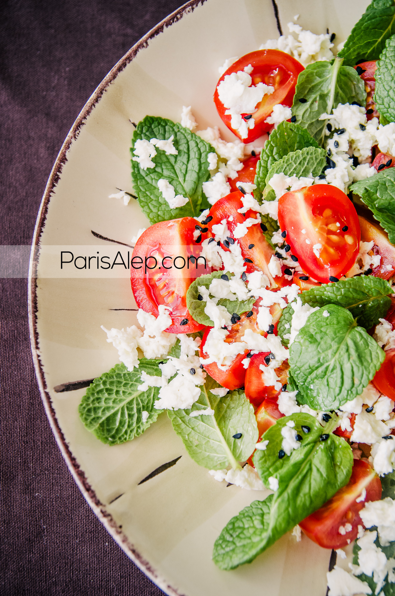 Voilà une recette qui n’est pas traditionnelle mais largement inspirée de la Syrie. Elle n’est pas du tout de saison, en revanche, avec des tomates cerises on peut avoir un résultat bien goûteux (et plus esthétique !). Je fais souvent cette salade avec de la menthe ou même de la roquette. Et je rajoute des graines de nigelle (en plus de celles que l’on trouve à la base dans le fromage), qui apportent un goût original à la salade, et de la mélasse de grenade pour la note sucrée.
