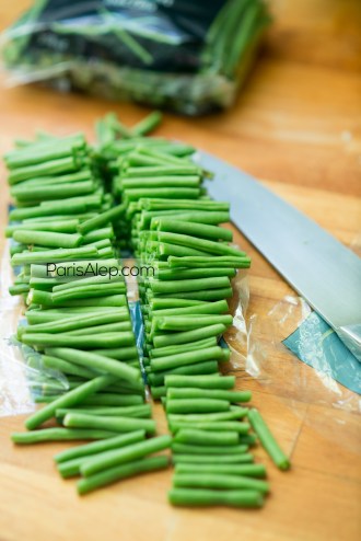 Pendant ce temps, couper les haricots (environ 5 cm de longueur pour moi). Les ajouter aux oignons.