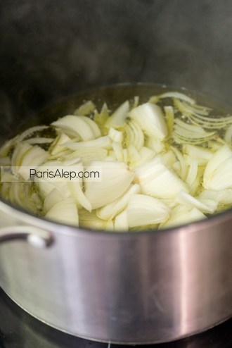 (Sur la photo ci-dessous, j’avais oublié d’ajouter l’ail et la coriandre, il vaut mieux les ajouter en même temps que les oignons dans l’huile d’olive)