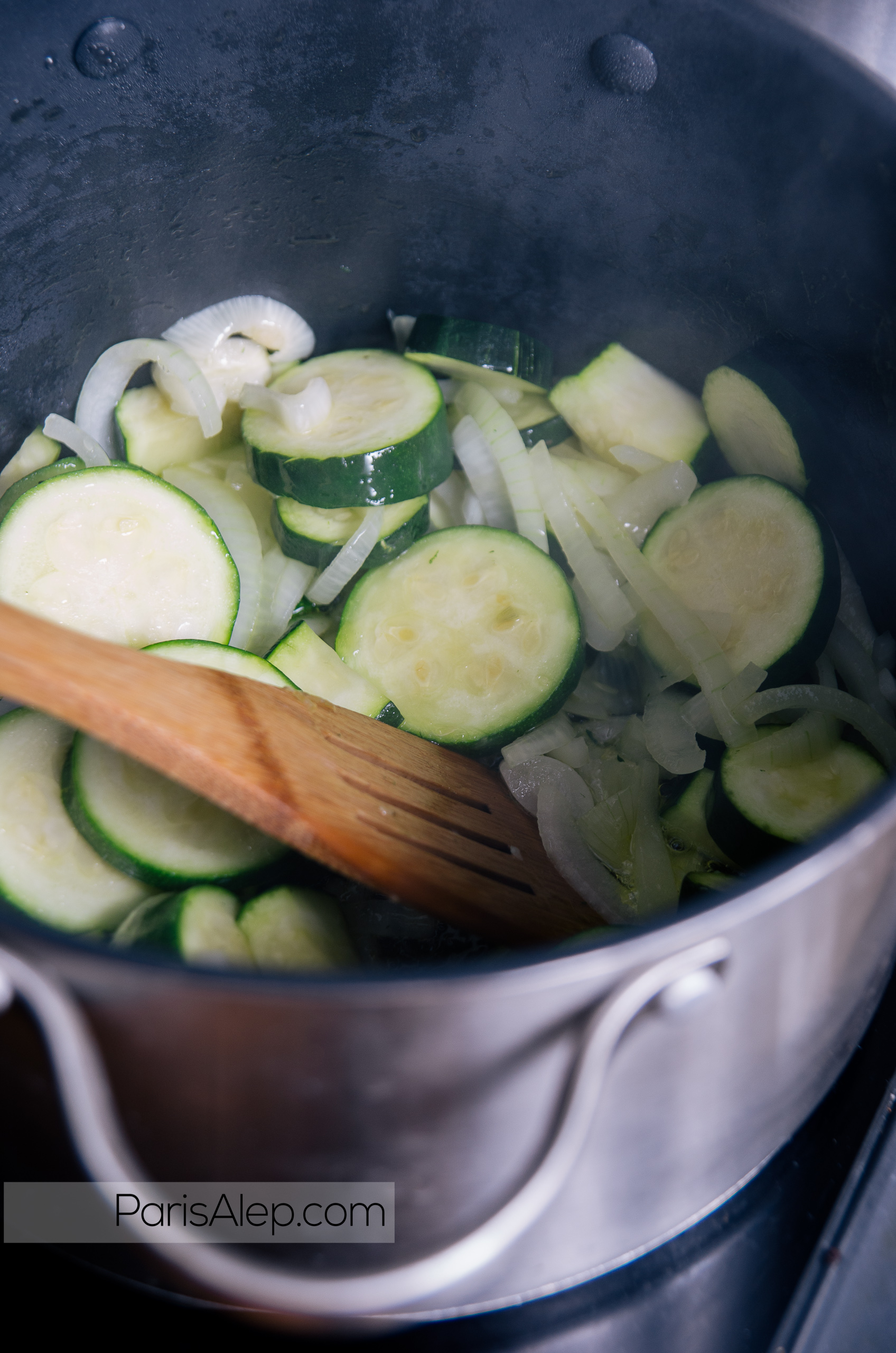 Faire suer l’oignon et les courgettes avec la gousse d’ail écrasée