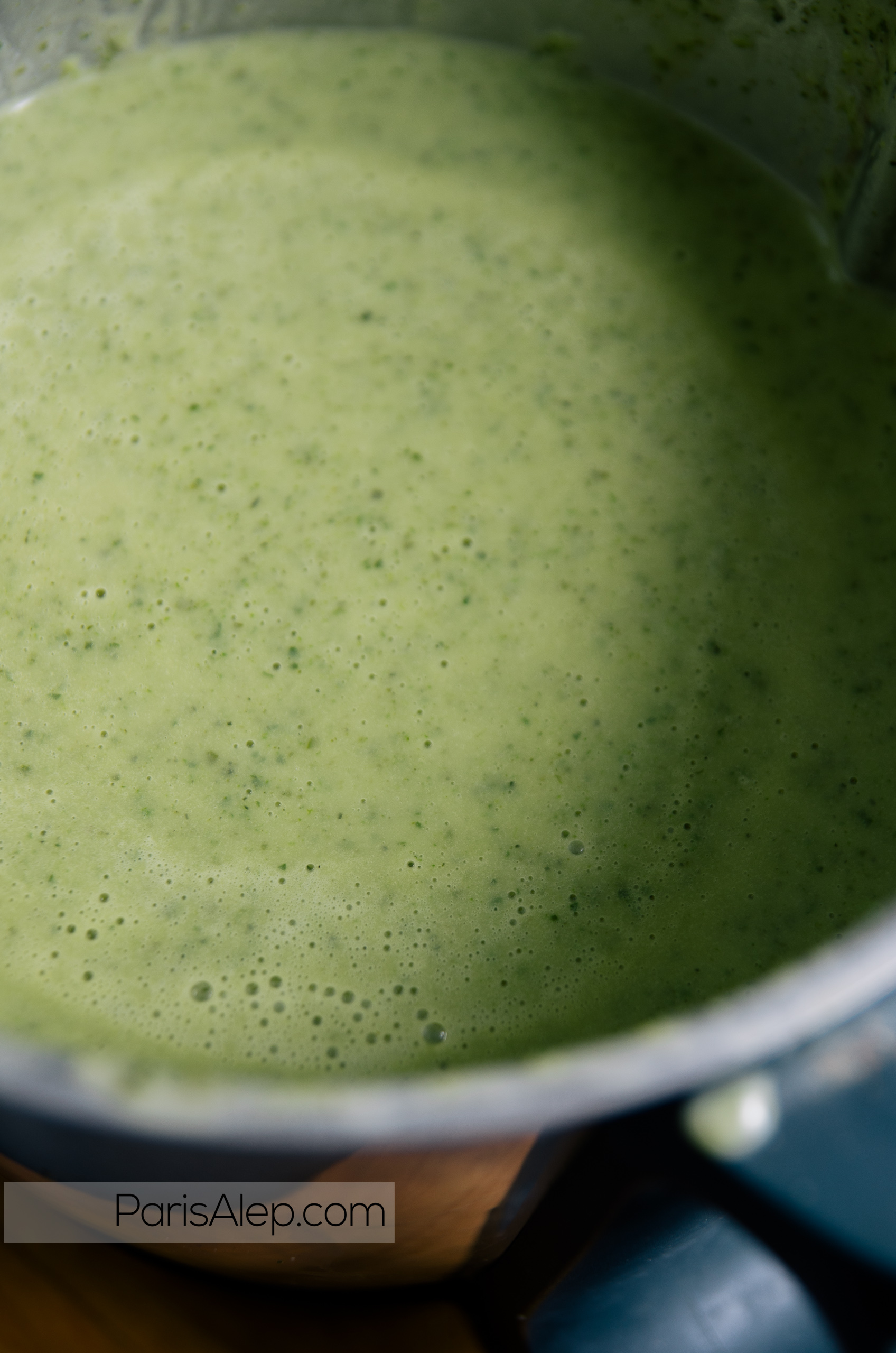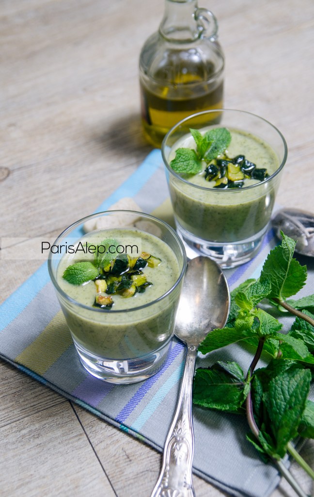 Cette recette de velouté de courgettes, je l’ai photographié il y a déjà 6 ans ! J’ai depuis longtemps envie de la partager avec vous. C’est une recette que j’ai apprise lors d’un cours de cuisine amateur dans une école Lenôtre. On avait fait plusieurs recettes simples et rapides mais c’est celle que j’avais préférée, la plus originale ! Et depuis je la refais tous les ans quand les courgettes sont de saison, elle fait désormais partie de mon répertoire de recettes. Ma mère l’a aussi adoptée ! Elle est savoureuse et tout le monde aime ! Elle me rappelle les saveurs syriennes avec l’ail, la menthe (qu’on utilise beaucoup en cuisine, dans les bouillons) et l’huile d’olive.