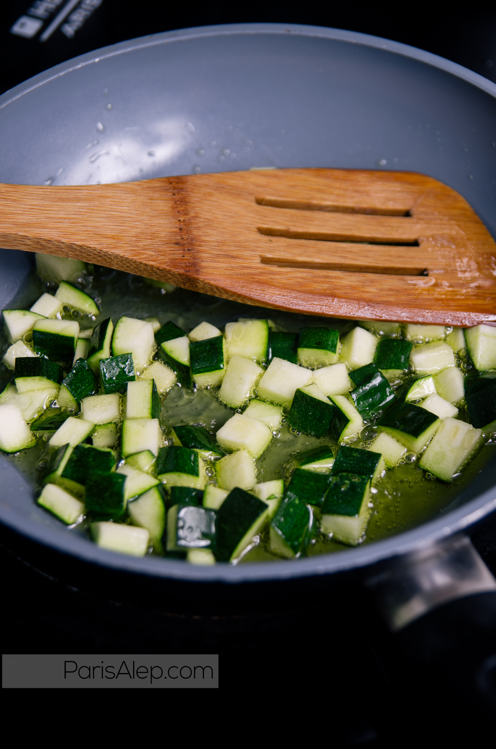 Mixer parfaitement. Poêler la brunoise de courgettes quelques minutes dans l’huile d’olive.